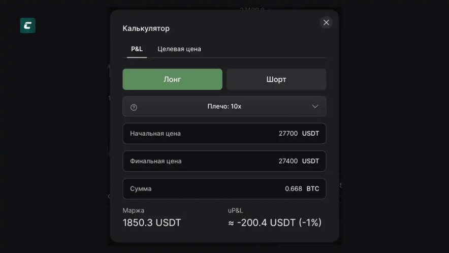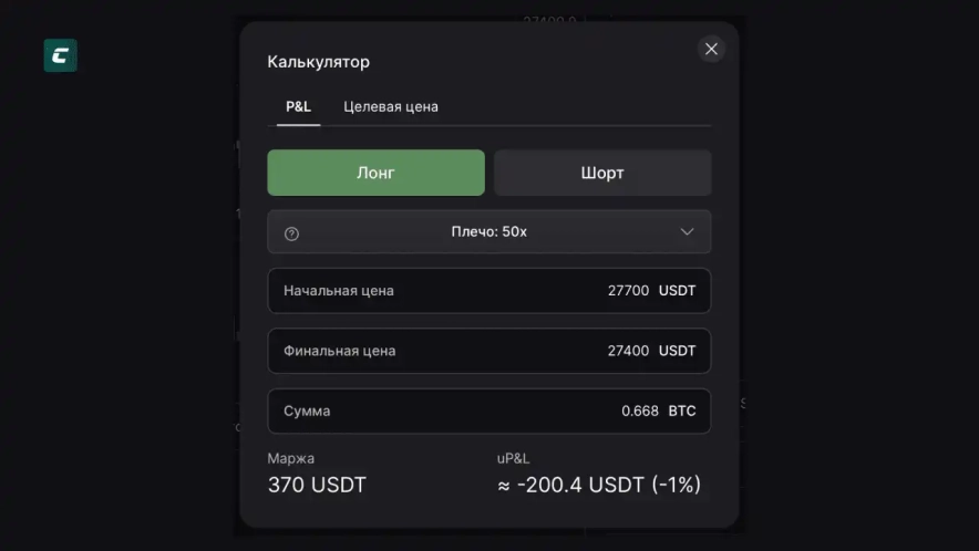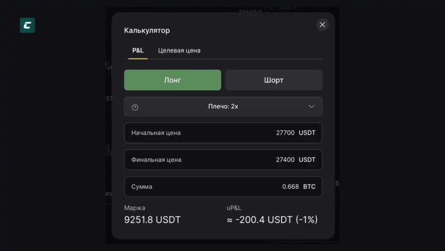 Уявімо, що у нас є депозит у 20000$ і ми хочемо відкрити угоду з ризиком 1% від цього депозиту - тобто максимум можемо втратити 200$. Я відкриваю позицію по BTC в лонг від 27700$, стоп-лосс планую встановити на рівні 27400$. Кредитне плече - 2x.