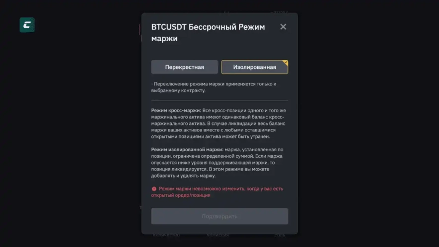 Крос-маржа (Cross-Margin): цей підхід до маржинального забезпечення дає змогу трейдеру використовувати свій фʼючерсний депозит для покриття маржі за всіма позиціями. Таким чином, при встановленні крос-маржі та відкритті угоди на 100$ навіть з 100х плечем, рівень ліквідації вашої позиції може бути значно далі, оскільки вона забезпечується сумою всього вашого фʼючерсного балансу. Також забезпечення, доступне для однієї позиції, може використовуватися для покриття маржі інших позицій. Це може бути вигідно в тому випадку, якщо одна позиція має збиткову динаміку, але інша приносить прибуток, і загальний результат залишається позитивним.