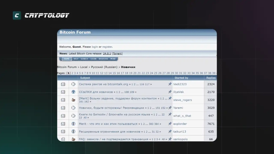 - Запущений у 2009 році, форум Bitcointalk є одним із найстаріших і найактивніших форумів про криптовалюти з більш ніж 3,5 мільйонами зареєстрованих членів і 60 мільйонами повідомлень у різних розділах. Є на Bitcointalk і російськомовна спільнота.