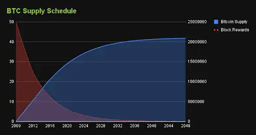 Винагорода за блок зменшується вдвічі кожні 210 000 блоків, що відбувається раз на чотири роки. Від початку існування мережі BTC з 3 січня 2009 року, коли було створено перший блок (генезис-блок), винагорода за блок скорочувалася тричі - з 50 BTC до 25 BTC, потім до 12,5 BTC і 6,25 BTC. Таким чином, можна передбачити кількість монет, що видобуваються щороку. Передбачається, що останній BTC буде видобуто приблизно в 2140 році.