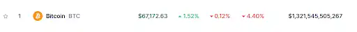 Bitcoin, як флагманська криптовалюта, утримує лідируючі позиції за ринковою капіталізацією. На поточний момент його ринкова капіталізація становить $1 321 368 945 773.