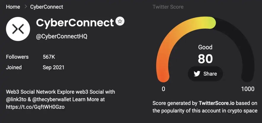 Сервіс TwitterScore виставив акаунту оцінку - 80 пунктів. Методологія аналізу розраховує популярність проєкту в криптопросторі. В основному на оцінку впливають підписки великих акаунтів. Що більше впливових сторінок підписано на акаунт, то більший рейтинг.