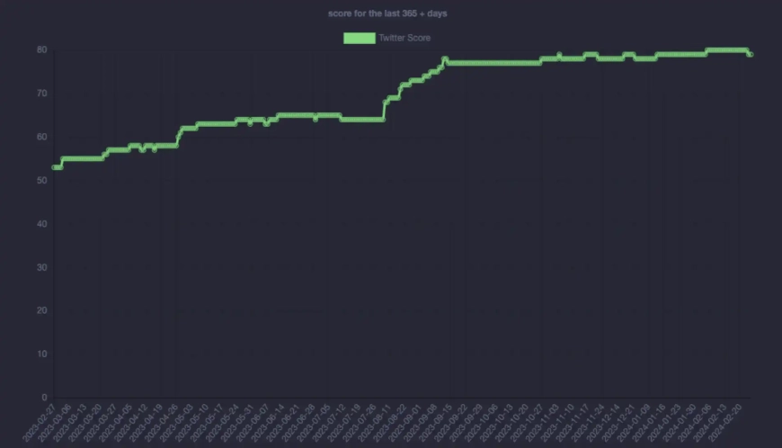Оцінка в 79 балів, свідчить про його сильну присутність у соціальних мережах і рівень залученості в Twitter. Цей показник відображає, наскільки активний проєкт на платформі, як часто він взаємодіє зі своєю спільнотою і яка загальна віддача від його твітів. Наразі тенденція підписок скорочується.