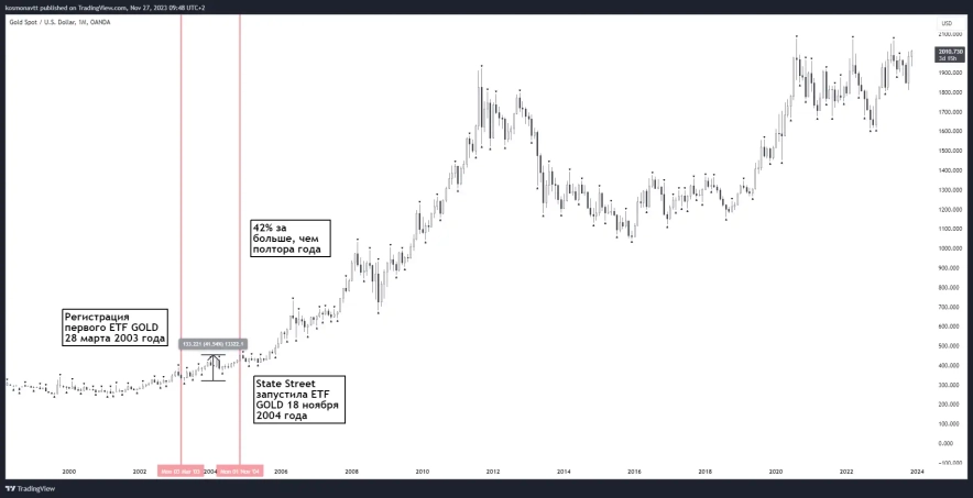 Нагадує поточну ситуацію з Bitcoin, чи не так? Найкращий приклад, з яким ми можемо порівняти майбутню ситуацію, це запуск ETF прабатька "цифрового золота".