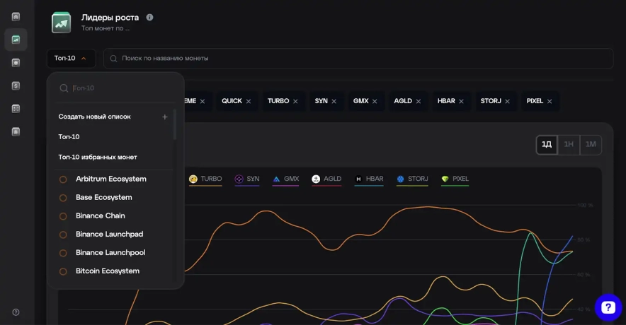 - Аналіз за секторами: користувач може вибрати один із 46 доступних секторів крипторинку, щоб аналізувати лідерів зростання в конкретній галузі. Це допомагає зосередитися на тих активах, які мають найбільший потенціал у певних ринкових умовах, і порівнювати їх з іншими учасниками тієї ж категорії.