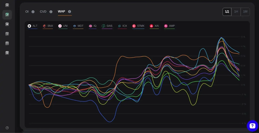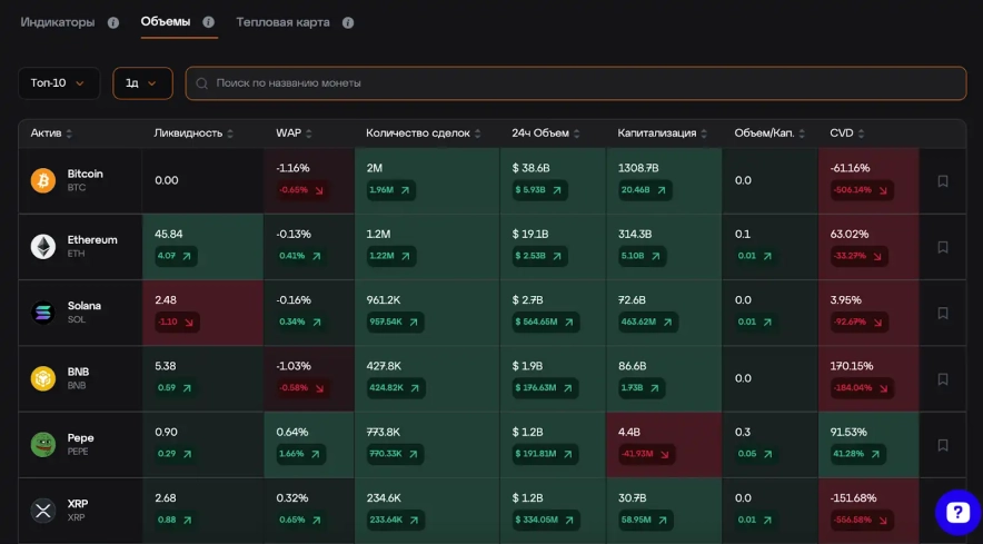 Користувач може вивчати дані про ліквідність, Weighted Average Price (WAP), кількість угод, капіталізацію, співвідношення капіталізації до обсягів і Cumulative Volume Delta (CVD вимірює накопичену різницю між обсягом купівель і продажів і допомагає оцінити ринкові настрої).