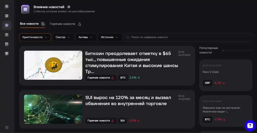 Розділ "Вплив новин" у Key Screener - це інструмент для аналізу новинного фону, який допомагає користувачам оцінювати вплив новин на ринок криптовалют і окремо взятих активів. Користувач отримує доступ до актуальних новин зі світу криптовалют, а також макроекономічних подій, що дає змогу швидко знаходити інформацію щодо конкретних активів, секторів і глобальних економічних даних.