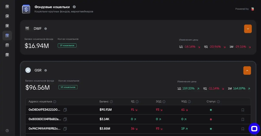 - Аналіз дій великих гравців: у цьому розділі зібрано дані про гаманці великих фондів і маркетмейкерів. Користувачі можуть бачити, які активи вони купують або продають, і на основі цієї інформації оцінювати поточні ринкові настрої та можливі майбутні рухи цін. Це дає можливість "підглянути" за діями інвестиційних фондів, які мають значний вплив на ринок.