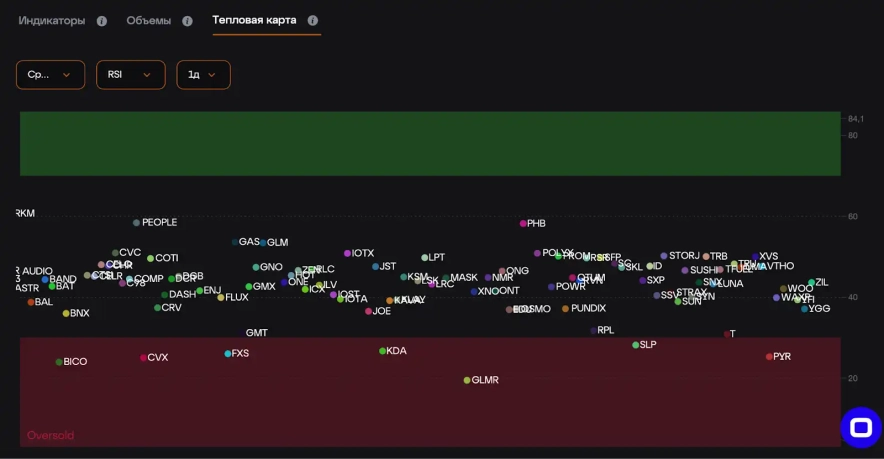 Користувачі можуть сортувати список активів за такими параметрами, як сектор, відкритий інтерес, RSI, кількість угод за останні 24 години, обсяг торгів за 24 години та інші показники. Це дає можливість швидко знаходити активи, які відповідають заданим критеріям.