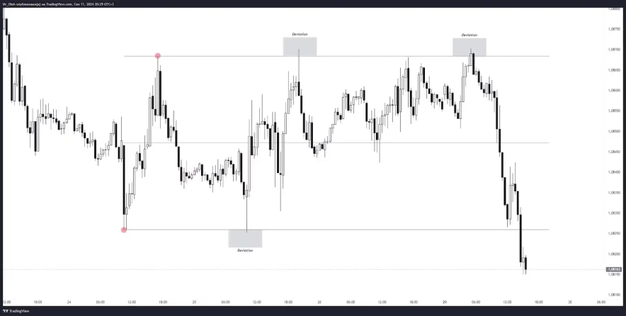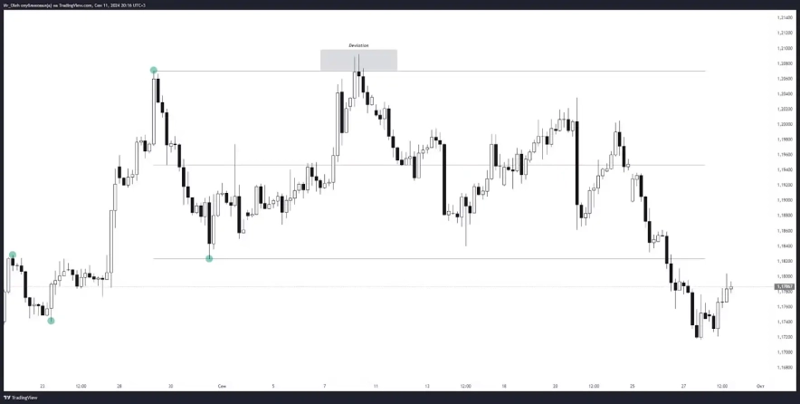 Для трейдерів важливо визначити слабкість однієї зі сторін ринку під час девіації. Наприклад, якщо ціна виходить за межі верхньої границі боковика, треба оцінити, чи є ознаки слабкості покупця. Якщо за межами боковика не формується злам структури на LTF, то девіація може не підтверджуватись.