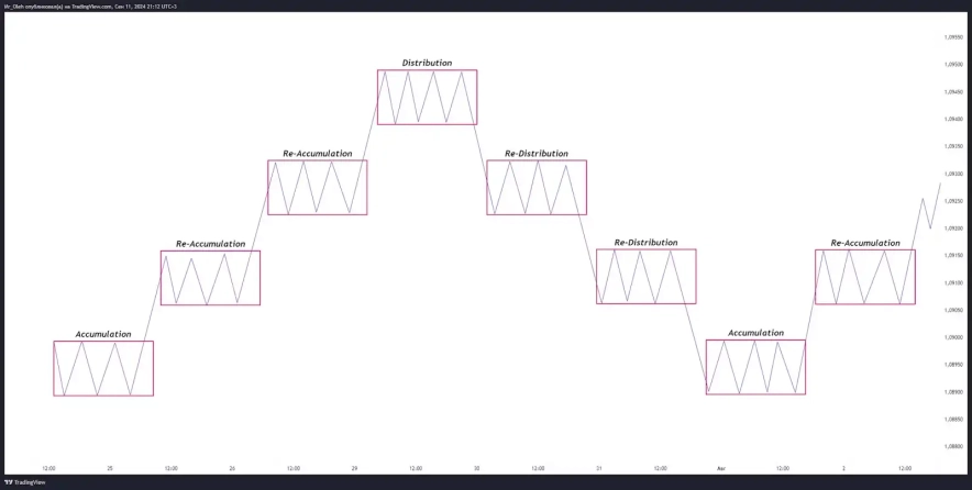 - Додатково до основних фаз, ринок може мати фази ре-акумуляції та ре-дистрибуції. У фазі ре-акумуляції учасники ринку продовжують набирати позиції на висхідному тренді, тоді як у фазі ре-дистрибуції відбувається розподіл позицій на низхідному тренді. Ці фази часто формуються під час корекцій, коли ціна тимчасово зупиняється перед продовженням основного тренду.