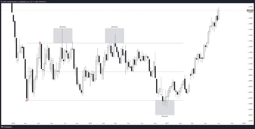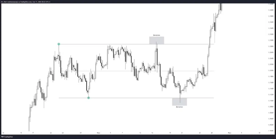 Після того, як ціна виходить за границі бокового руху (наприклад, вище верхньої границі), вона може швидко повернутися в протилежному напрямку, для тесту 0,5 діапазону, або похід за ліквідністю з іншого боку. Це важливо враховувати при торгівлі, оскільки девіації можуть призвести до раптових змін цінових тенденцій.