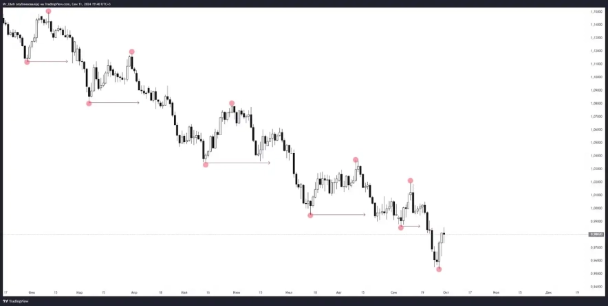 1. Приклад низхідного тренду: як зображено на графіку, ціна при низхідному тренді оновлює структурні мінімуми, в той час, як максимуми знижуються.