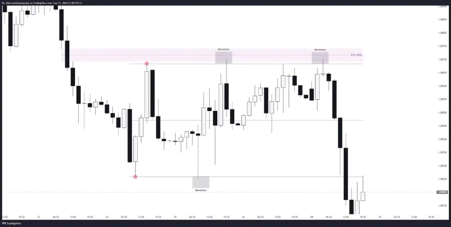 Девіація — це здебільшого маніпулятивний ціновий рух, який відбувається за границями бокового руху. Метою девіації є зняття зовнішньої ліквідності, або тестом POI для подальшого повернення в діапазон, ціллю може виступати тест 0,5 діапазону, або зовнішня ліквідність з іншої сторони боковика.
