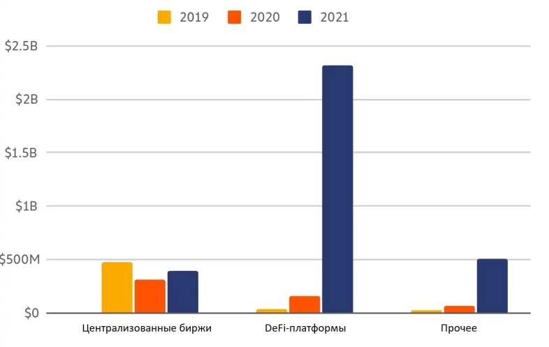 DeFi платформи набули особливої популярності у 2020-2021 році. У 2020 році платформи DeFi зіткнулися з втратою криптовалюти на суму майже 162 мільйони доларів, що склало 31% загального обсягу крадіжок упродовж року і на 335% перевищило рівень 2019 року. У 2021 році цей показник зріс ще на 1330%. Іншими словами, у міру розширення платформ DeFi посилюється і проблема крадіжок. Це свідчить про необхідність підвищення безпеки в цьому секторі. Користувачі централізованих бірж страждають від крадіжок набагато рідше. Це і пов'язано з перевіркою KYC, яка зараз є обов'язковою практично на всіх популярних біржах.