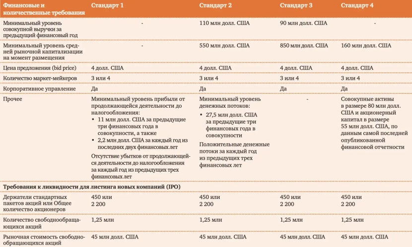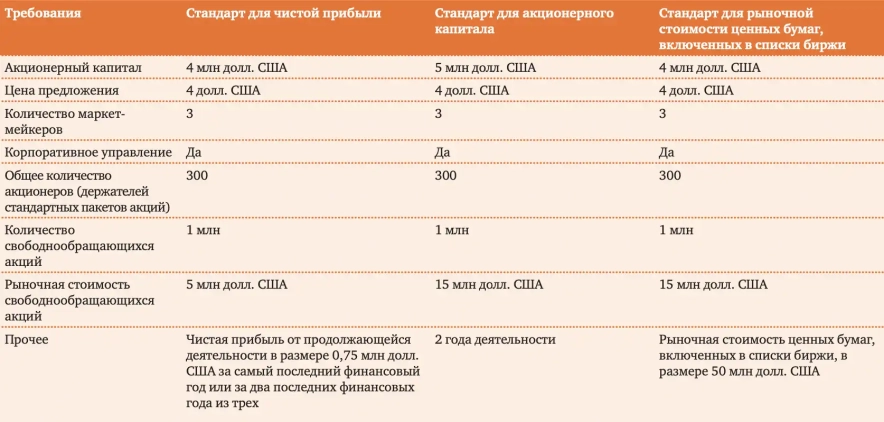 Будь-який емітент, чи то локальний, чи то іноземний приватний, зобов'язаний відповідати встановленим мінімальним критеріям щодо розподілу та ринкової вартості, а також обрати один із фінансових стандартів.