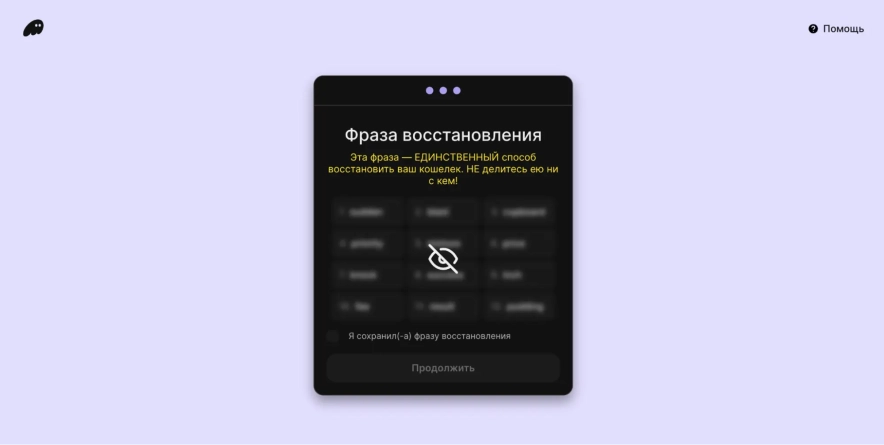 Після цього додаток автоматично згенерує для вас сід-фразу — це набір з 12 слів, який є ключем до вашого облікового запису. Її потрібно обов'язково записати і зберігати в безпечному місці: на папері, в офлайн-сховищі або в спеціальному менеджері паролів. Ніколи не діліться цією фразою з іншими людьми, тому що вона дає повний доступ до ваших коштів.