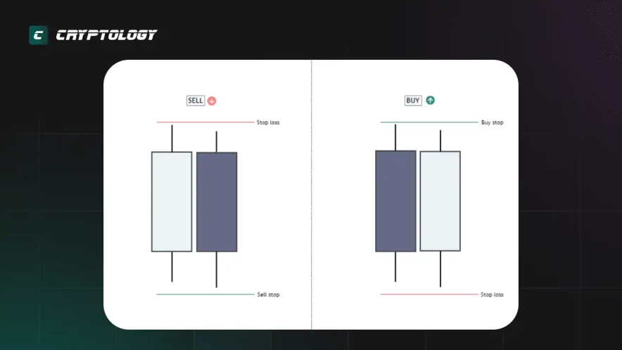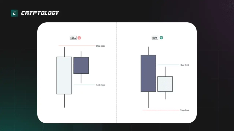 Внутрішній бар повністю знаходиться всередині діапазону попередньої свічки, що може свідчити про можливий початок нового тренду після прориву меж материнського бару. Для зниження ризиків стоп-лос зазвичай встановлюють за межами материнської свічки.