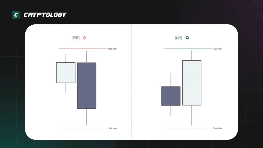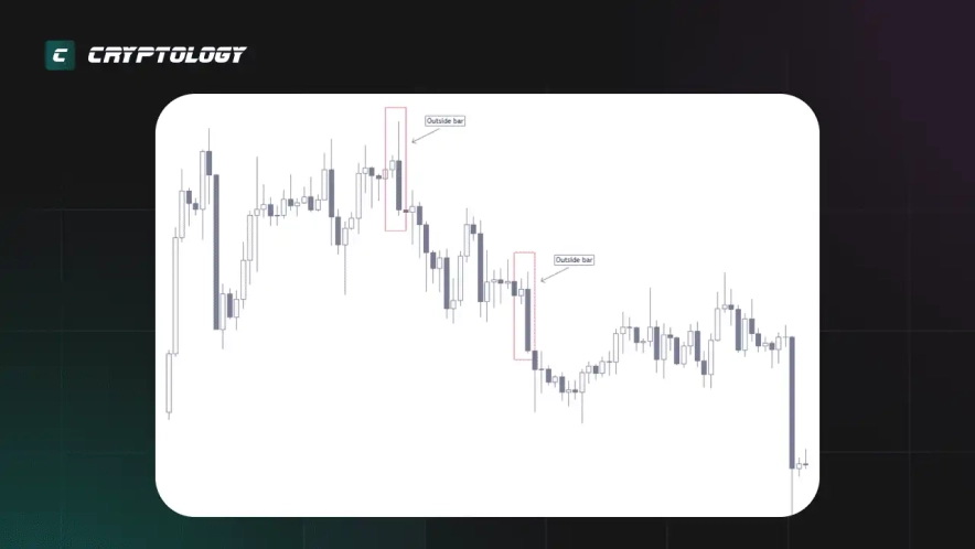 Зовнішній бар "поглинає" попередню свічку, сигналізуючи про можливий розворот тренду. У висхідному тренді ведмежий зовнішній бар може вказувати на потенційний спад, особливо якщо він утворюється на рівні опору. Для управління ризиками стоп-лос рекомендується розміщувати трохи вище максимуму моделі.