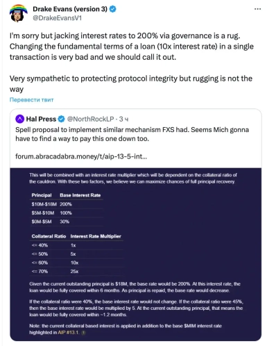 Паралельно починають діяти інші зацікавлені лиця, наприклад, зараз кредитор фаундера Curve намагається вставляти палки в колеса аби витряхнути Єгорова. Вони починають просувати пропозицію про підняття базової ставки фінансування на великі займи до 200% річних, що ДУЖЕ багато для ринків. Вони зацікавлені в тому, аби повернути свої 14.5м стейблів