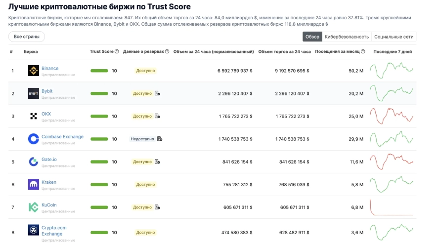 На даному агрегаторі ви зможете знайти інформацію про криптобіржі, які вас цікавлять - DEX або CEX, а також рівень довіри про ту чи іншу біржу.