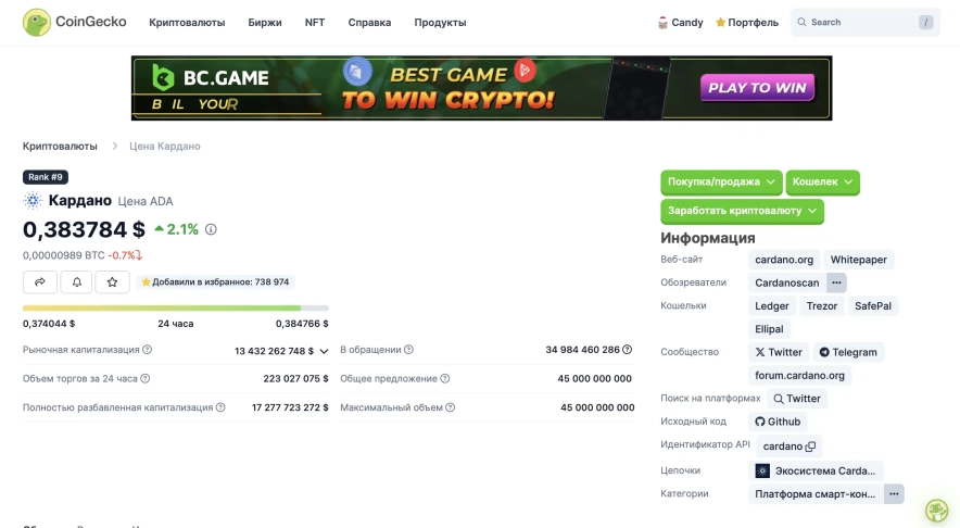 CoinGecko є найближчим конкурентом CoinMarketCap. Це подібний до CoinMarketCap агрегатор даних, на якому ви можете знайти найважливішу на початку аналізу інформацію про актив: ціну, капіталізацію, обсяг торгів за валютними парами, загальну пропозицію, біржі, на яких торгується.