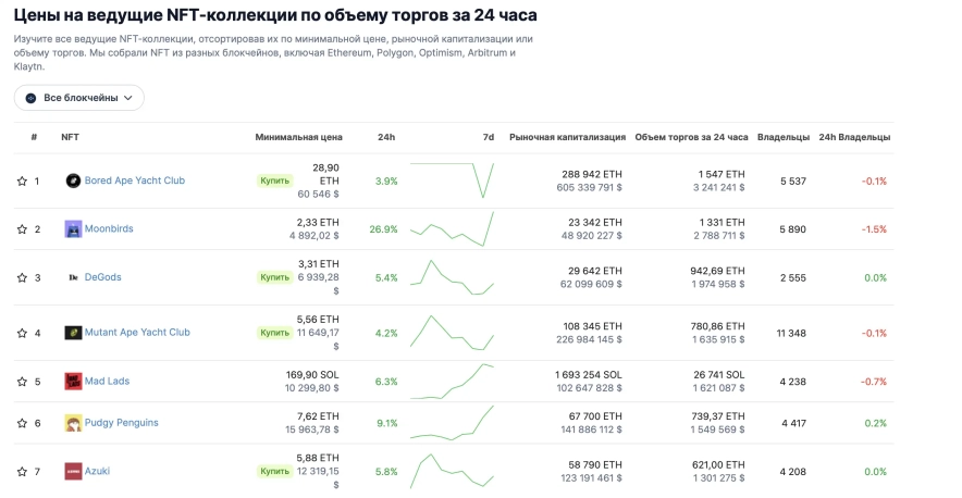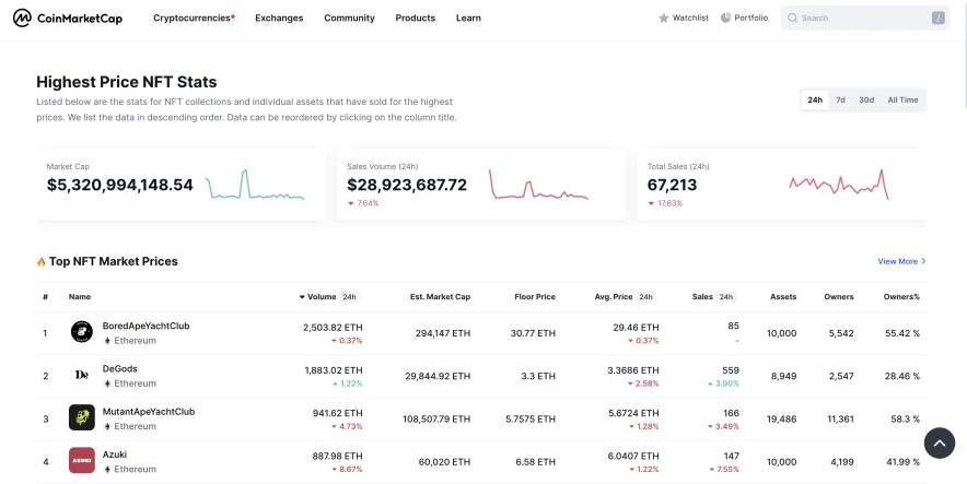 Крім вивчення цифрових монет і бірж, на яких вони торгуються, ви можете знайти тут інформацію про NFT ринок: найпопулярніші NFT колекції, їхня вартість, капіталізація, обсяг торгів і власники.