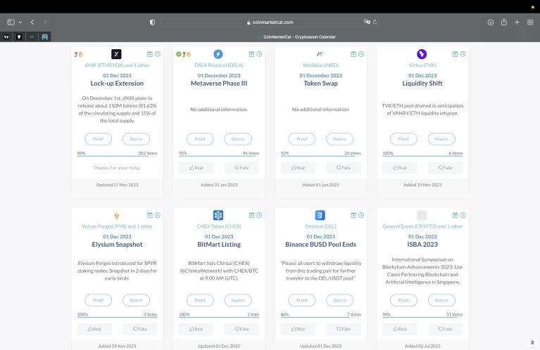 CoinMarketCal надає можливість швидко дізнатися про новини та важливі події в криптосфері на довгі роки вперед, що дає змогу заздалегідь підготуватися й розглянути можливості для заробітку.