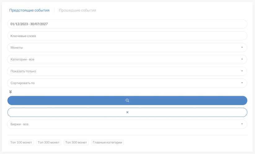 Отримати дані про всі майбутні події або для конкретної криптовалюти можна на головній сторінці сайту, використовуючи фільтри в додатковому меню. Тут ви можете провести сортування за датами, конкретними криптовалютами, біржами та іншими додатковими категоріями.