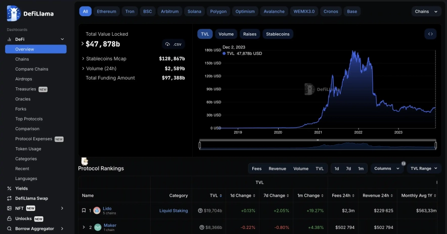 - Overwiev: перший дашборд, з якого майданчик починав своє існування. Тут користувач може вивчити інформацію про TVL засоби на тому чи іншому майданчику, або в певній мережі.
