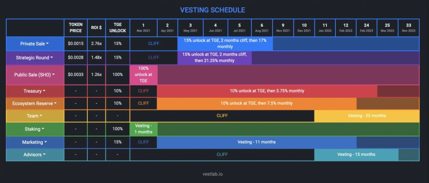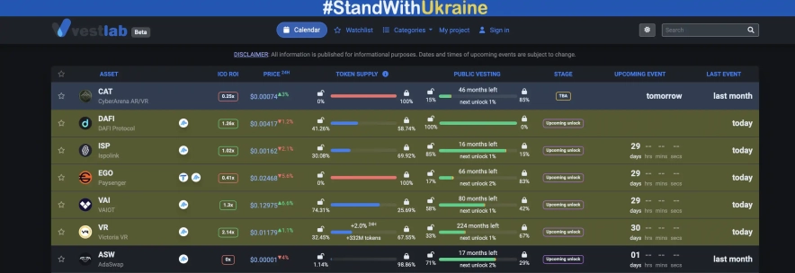 Не йдучи далеко від агрегаторів, хочемо розглянути ще один під назвою Vestlab. На цій платформі можна знайти важливу інформацію про проєкти. Тут ви зможете вивчити опис проєкту, знайти посилання на офіційні веб-сайти, а також whitepaper, інформацію про розподіл токенів, лаунчпад-платформи, де реалізуються токени, дати перших розблокувань, відсоток заблокованих і розблокованих токенів, хронологію випуску токенів, а також зворотний таймер до наступного розблокування.