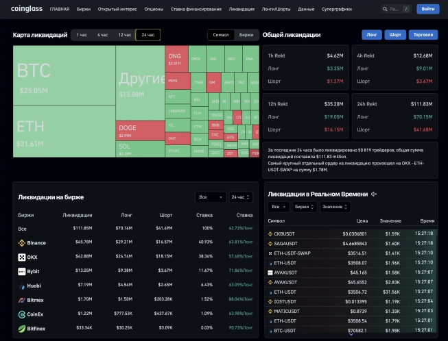 Розділ "Моніторинг ліквідацій" на платформі Coinglass надає великі дані про ліквідації позицій на різних криптовалютних біржах, що допомагає користувачам оцінити динаміку ринку.