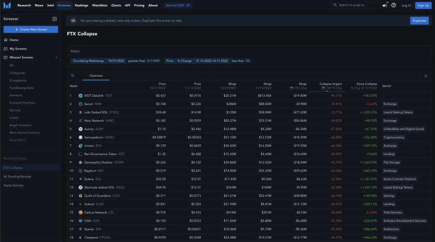Тут можна знайти найрізноманітніші скрінери, наприклад, як змінилися ціни активів після колапсу FTX.
