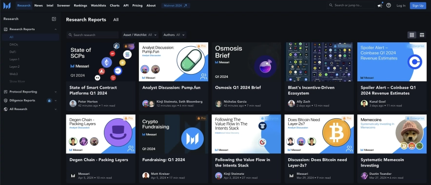 Аналітична команда Messari.io розробляє і публікує велику базу статей, яка містить різні дослідження і звіти. Матеріали в розділі Research охоплюють теми, пов'язані з Web3, DeFi, інфраструктурою, макроекономікою, а також різні аналітичні огляди.