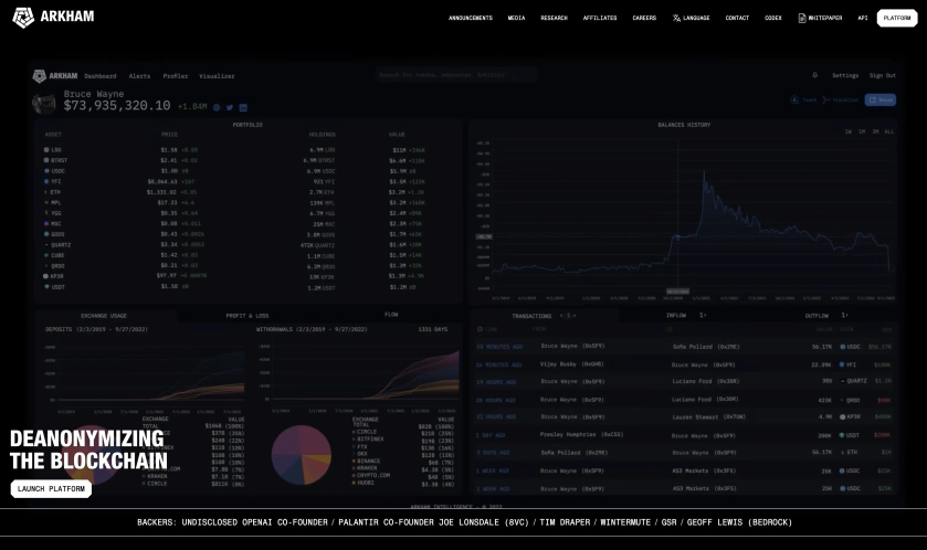Arkham застосовує штучний інтелект для деанонімізації блокчейн-транзакцій, виявляючи реальних людей і компанії за криптовалютними операціями. Платформа оснащена власною розробкою - AI механізмом ULTRA, який алгоритмічно пов'язує криптовалютні адреси з конкретними особистостями або компаніями.
