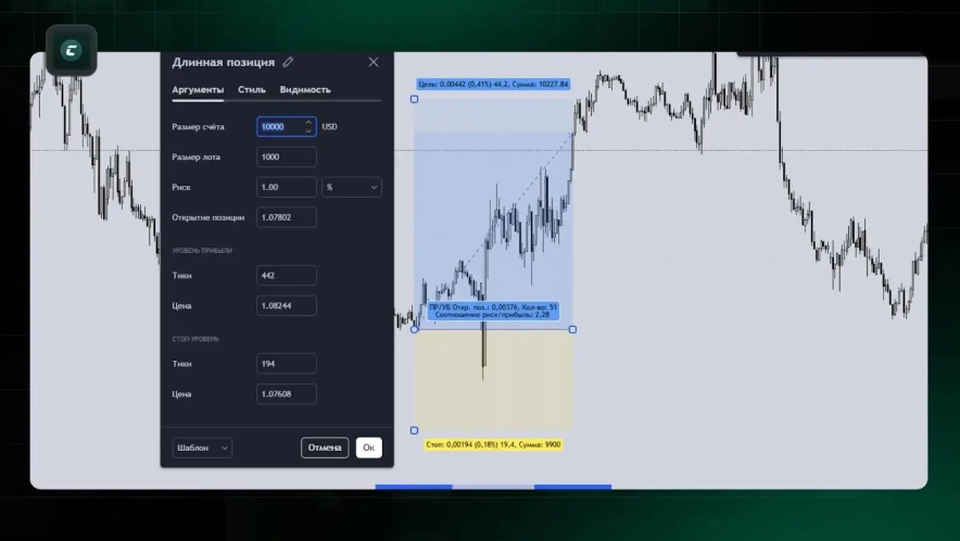 У сервісі TradingView є корисний інструмент, який дає можливість показати, який вигляд має позиція візуально на графіку, а також розрахувати обсяг позиції і співвідношення ризику до прибутку. У налаштуваннях інструменту необхідно прописати правильні: розмір депозиту, розмір лота і ризик. Якщо всі ці значення правильні, то при правильному встановленні рівня входу і стоп-лосс - цей інструмент показуватиме необхідний обсяг для відкриття позиції.