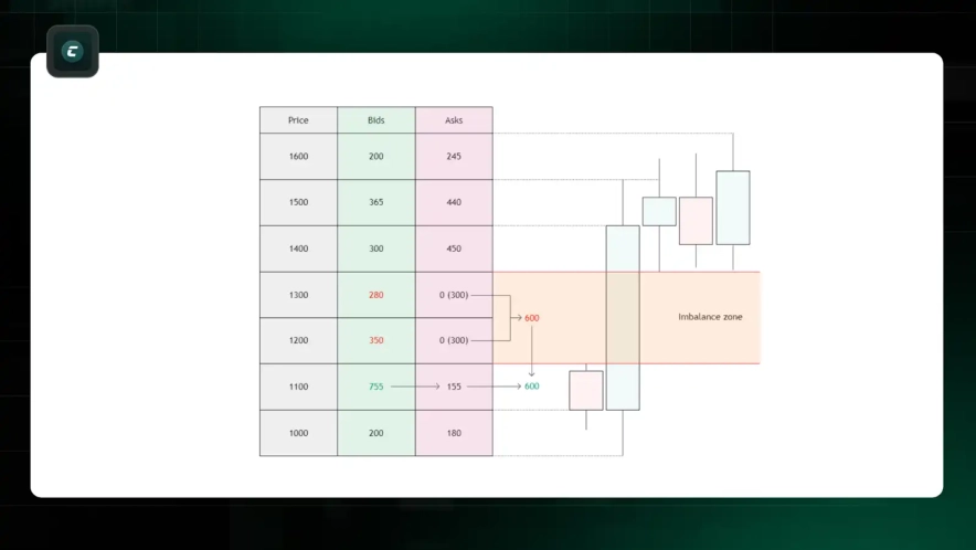 У нормальних умовах обсяг ордерів на купівлю та продаж на різних цінових рівнях приблизно рівний, що створює ефективні ринкові умови, де ціна рухається плавно. Проте, коли виникає дисбаланс (Imbalance), з'являється значна перевага покупців або продавців на певному рівні, що призводить до різких рухів ціни в одну сторону.