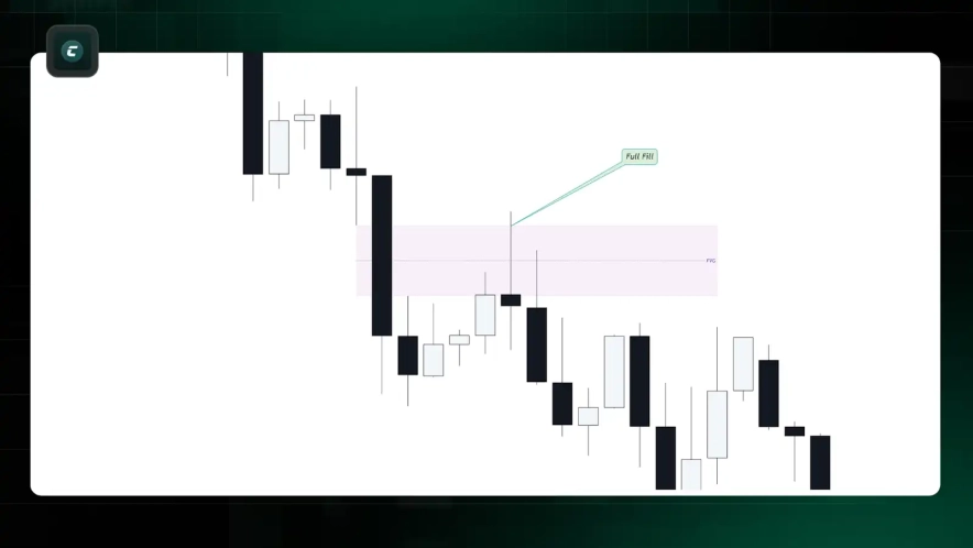 3. Full Fill — повне заповнення зони FVG; це часто знижує ймовірність повторного тесту.