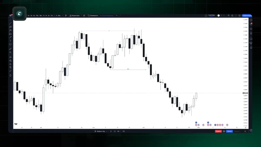 Відкриття графіку: перейдіть на сайт TradingView, увійдіть до свого акаунту або зареєструйтесь. Оберіть актив, для якого ви хочете протестувати стратегію, наприклад, валютну пару EUR/USD або криптовалюту BTC/USD.