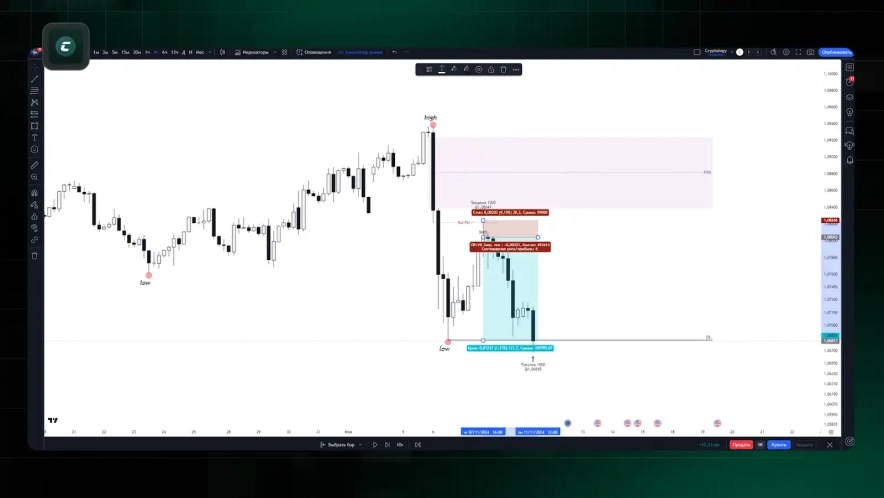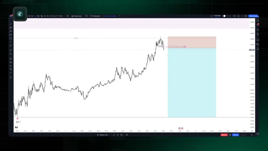 Від FullFill (повного перекриття FVG) отримуємо QM+FVG, де і будемо відкривати позицію від нашого патерну в області FVG зі стопом за свінг та таргетом на SSL.