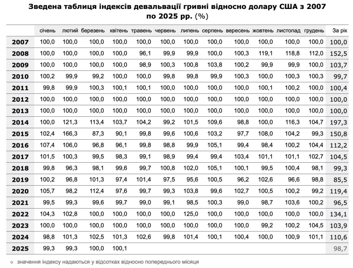У 2023 і 2024 роках темпи девальвації були помірними - близько 3-10% на рік, що свідчить про намагання стабілізувати ситуацію та контролювати валютний ринок. За перші місяці 2025 року середнє значення за місячними індексами поки що становить 98,7%, що вказує на помірне зміцнення або фіксацію курсу гривні.