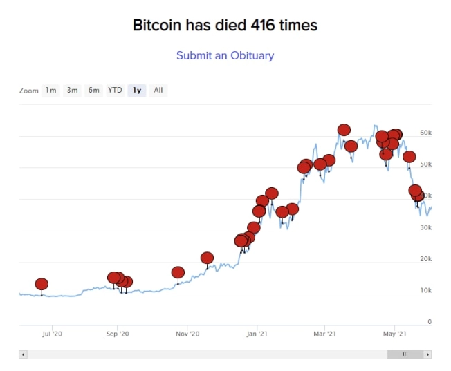 Графік: некрологія біткоїна. Протягом усіх циклів ринку біткоїн згадували в краху понад 416 разів.