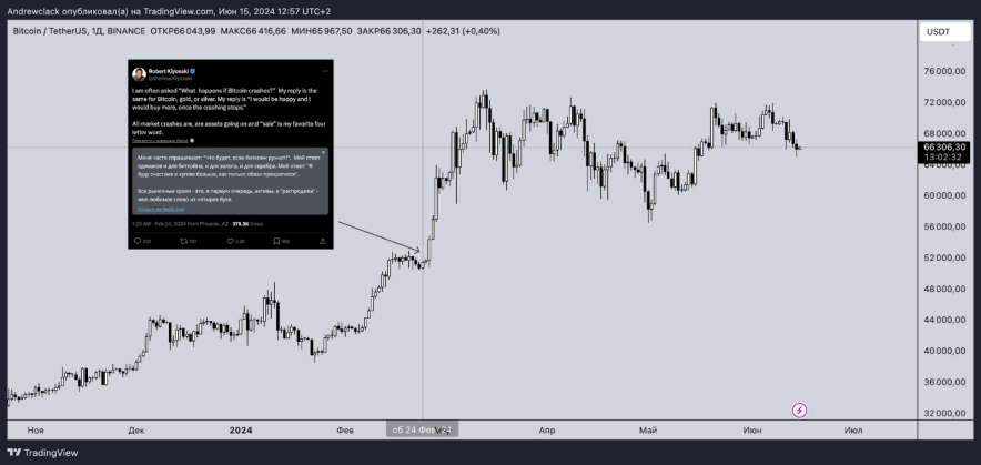Повідомлення Роберта Кійосакі про передбачувану корекцію біткоїна.