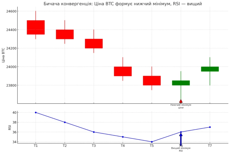 Бичача (bullish) конвергенція виникає, коли ціна формує нижчий мінімум, але індикатор при цьому формує вищий мінімум. Це сигналізує про ослаблення низхідного імпульсу ймовірний розворот вгору.