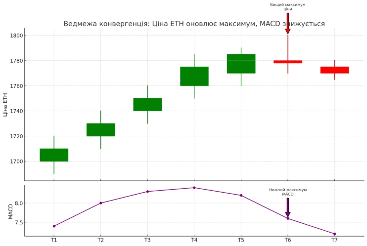 На графіку ETH/USD ціна оновлює локальний максимум: спочатку $1 720, потім $1 780. Але MACD у цей час формує відповідні піки на рівнях 8.4 та 7.6. Індикатор свідчить про зменшення сили зростання — хоча ціна ще зростає, внутрішній моментум сповільнюється.