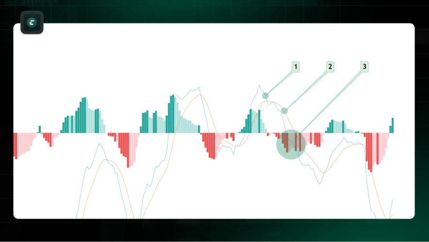 - Сигнальна лінія (2): EMA лінії MACD (зазвичай 9-періодна EMA).
