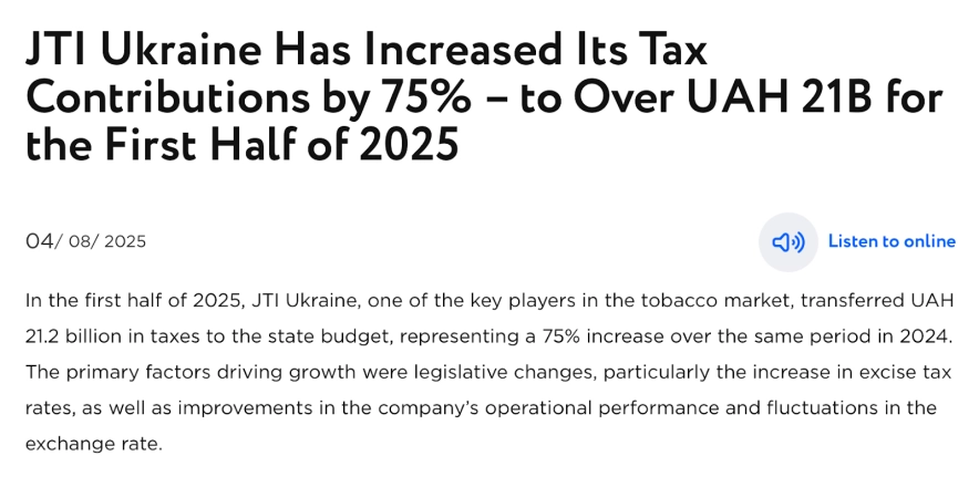 Наприклад, велика компанія JTI Ukraine перерахувала до бюджету за перше півріччя 2025 року 21,2 млрд грн у вигляді податків - зростання на 75% порівняно з минулим роком, при цьому акцизи зросли на 81%, ПДВ - на 73%, військовий збір - на 36%.