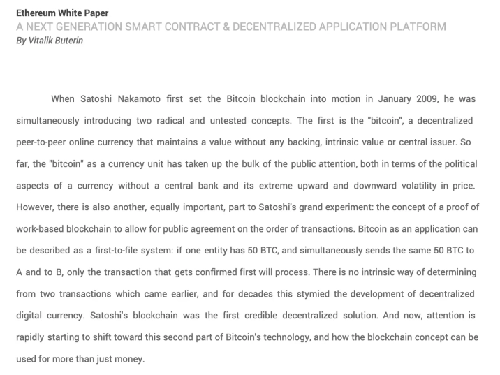 Другим за значимістю в історії криптовалют вважається whitepaper Ethereum, опублікований 2014 року Віталіком Бутеріним.