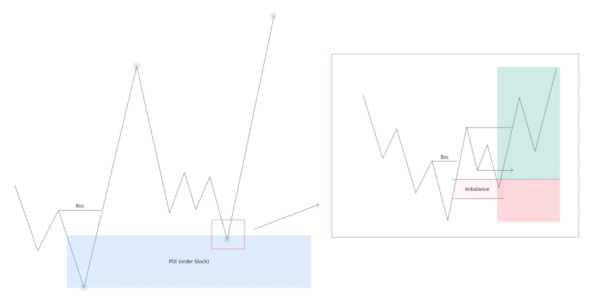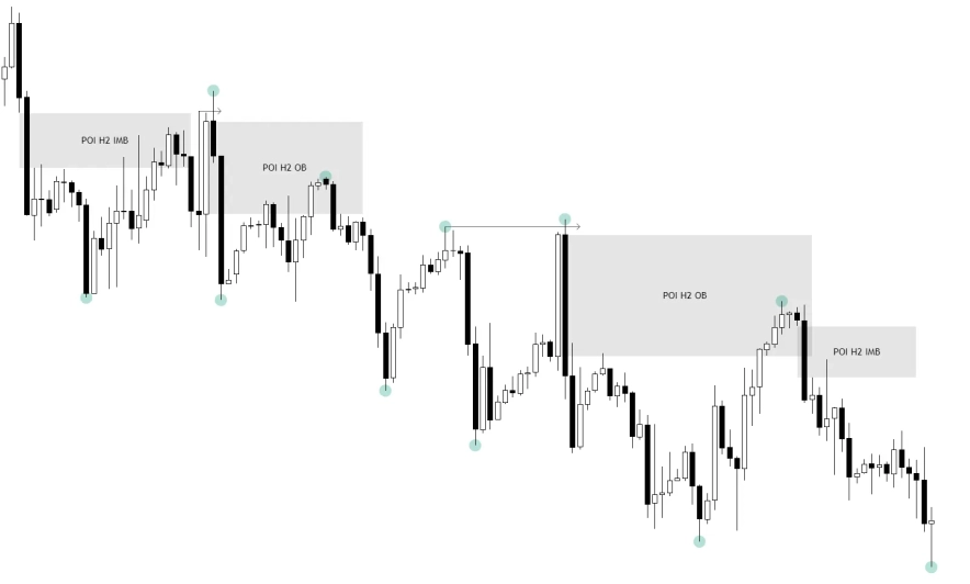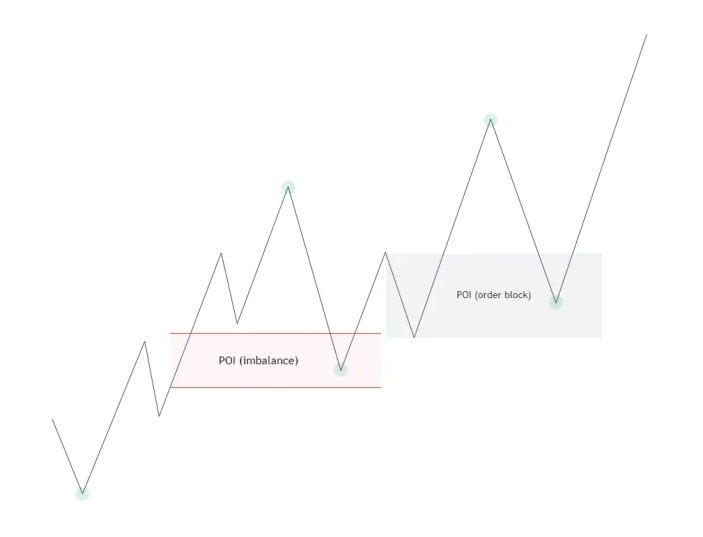 Під час трендового руху ціни, зонами інтересу (POI) будуть блоки і дисбаланси всередині імпульсу. Коли настане корекція, ми можемо очікувати її закінчення в одній з POI. Або ж, зони інтересу можуть формуватися на "піках" ціни, від яких ми згодом очікуватимемо на зміну тренда.