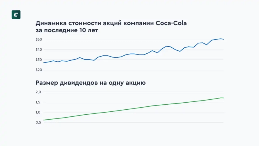 Однак не всі компанії їх виплачують. Наприклад, нині Tesla є акціями без дивідендів. Це означає, що акціонери не отримують виплат. Розглянемо детальніше дивіденди на прикладі компанії Coca Cola.